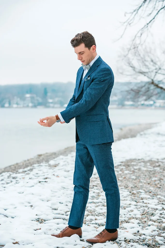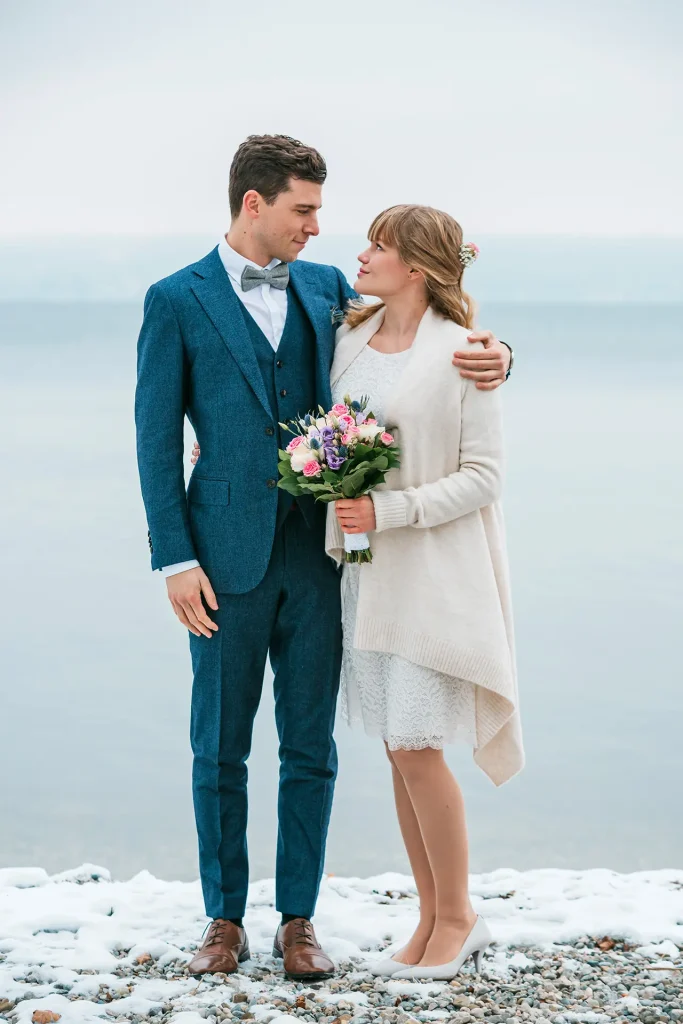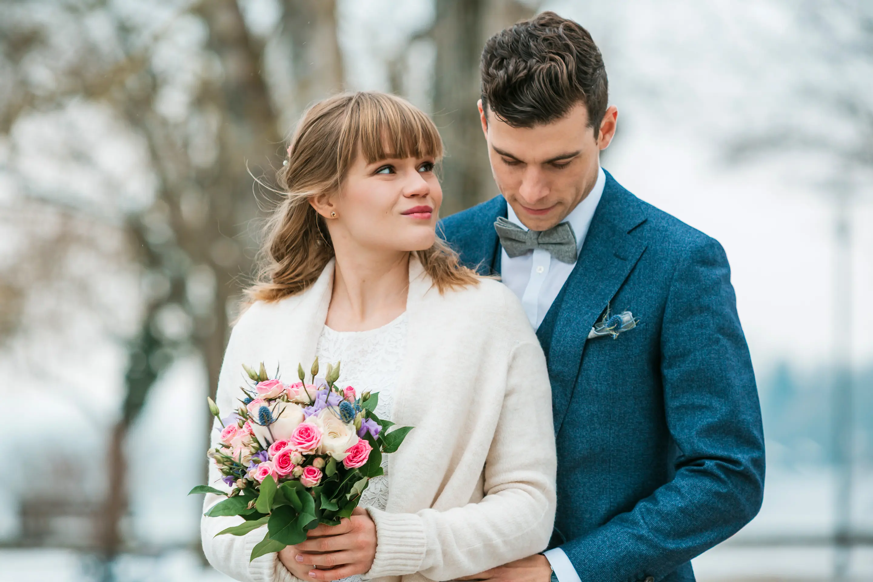 Eine Winterhochzeit erlaubt modisch ganz andere Möglichkeiten. Schwere Stoffe, Samt, Strick oder elegante Mäntel sehen auf Fotos hochwertig und strukturiert aus.